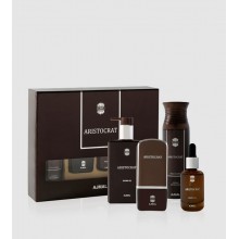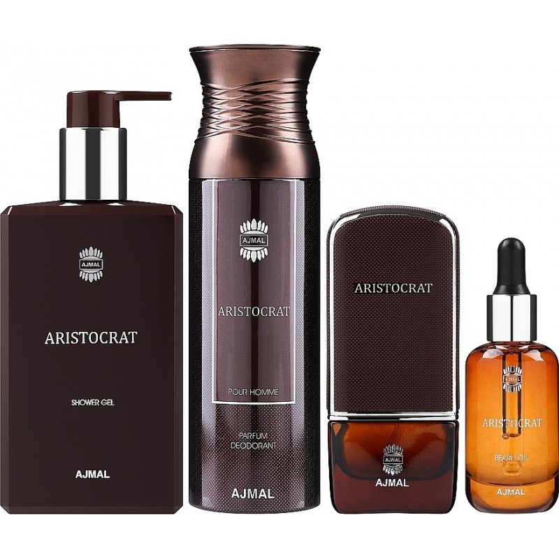 Set Cadou Ajmal, Aristocrat, apa de parfum, deodorant, gel de dus, ulei de barba, de barbat Parfum sofisticat care dezvăluie măreție, putere și eleganță. Parfum statutar și nobil care ajută la evocarea succesului social, este destinat bărbaților care doresc să se bucure de ingrediente nobile și puternice. Bergamota proaspătă și citrică cu pepene verde se scufundă în moscul care îmbrățișează inima pentru a se așeza pe o bază lemnoasă de chihlimbar care întruchipează luxul decadent cu o amprentă de lungă durată și îndrăzneață. Setul contine Apa de parfum 75 ml Gel de dus 200 ml Deodorant spray 200 ml Ulei de barba 30 ml