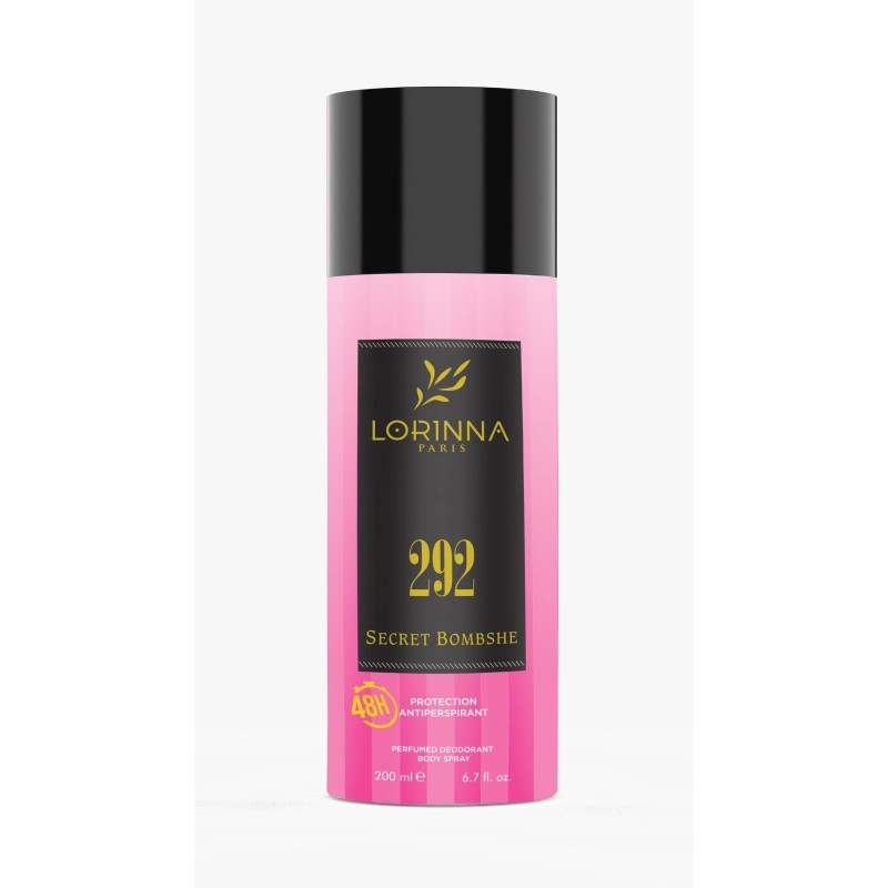 Deodorant spray Lorinna Secret Bombshe nr. 292, de dama 200 ml inspirat din Secret Bombshell Notele de varf sunt maracuia, grapefruit, ananas, mandarina si capsuni; Notele de mijloc sunt bujor, orhidee vanilata, fructe rosii, iasomie si lacramioare; Notele de baza sunt mosc, note lemnoase si lichen.